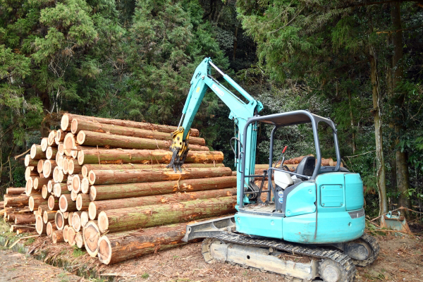 伐採(収穫)した丸太は、ケーブルなどで吊るして山から林道まで運び出されたり、ウインチで引っ張ったりして搬出されます。積みおろし機などで集めてトラックに積み込まれ、原木市場や貯木場へ運ばれます。原木市場や貯木場へ運ばれた木材は競りで製材業者に買われます。また、直接製材工場に運搬される場合もあります。